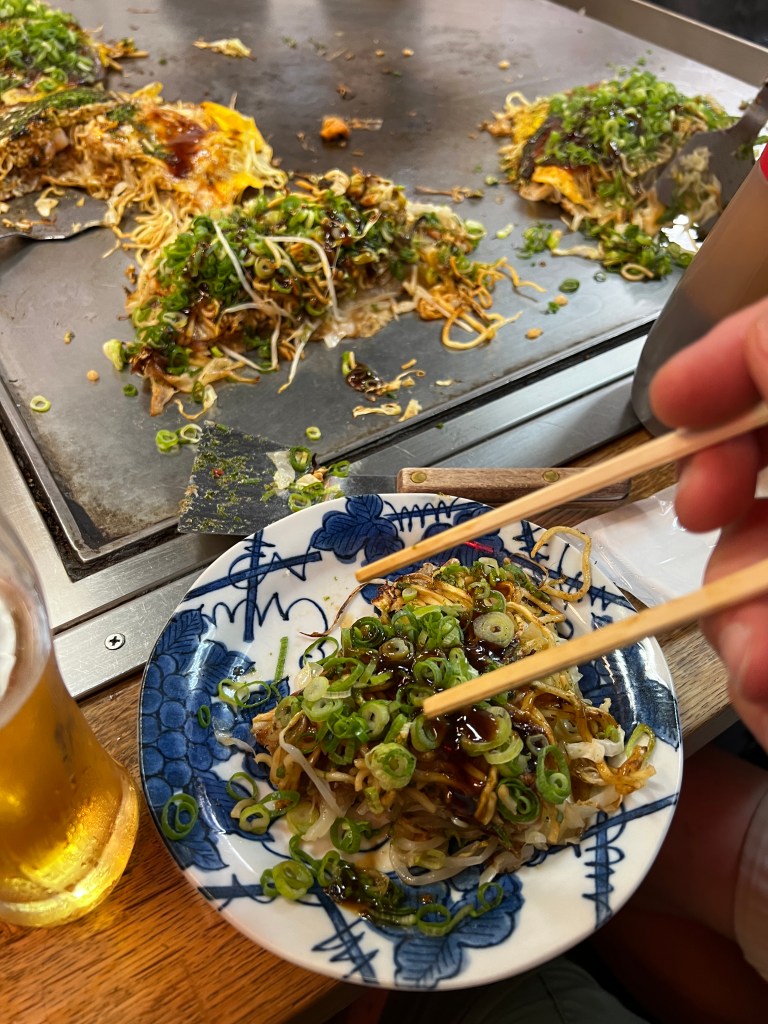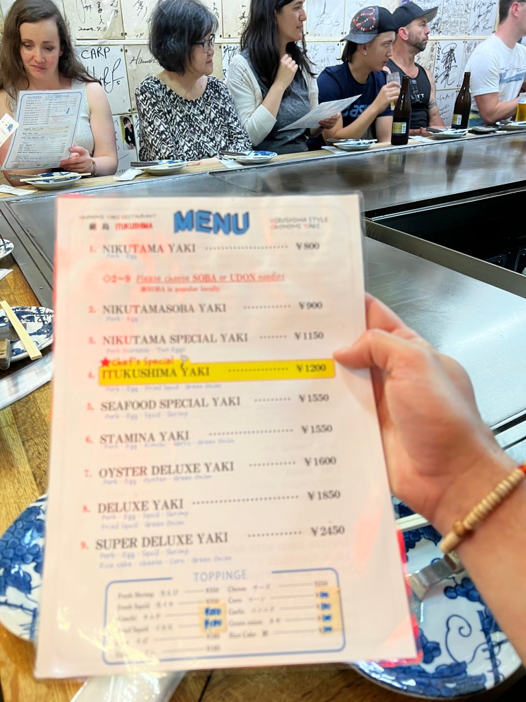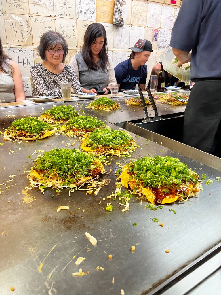 Our guide took us on a walk through the busy shopping district on our way to an Okonomiyaki dinner. A traditional dish of Hiroshima, it means “as you like it” and I’ve read it described as a Japanese pancake, pizza and omelet. A little outside my comfort zone…but I absolutely loved it.