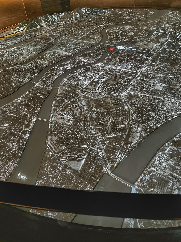 Immediately the black-and-white picture from history springs to mind. It seems hard to believe you are standing in front of it in real life. We walked a couple blocks to the “hypocenter” where the bomb detonated about 2000 feet above the city. To be standing in the spot where the first and only one of two atomic bomb attacks took place was absolutely chilling.