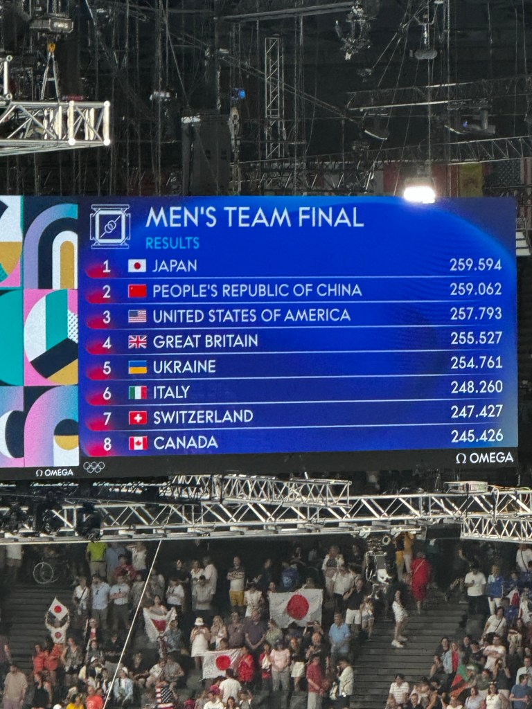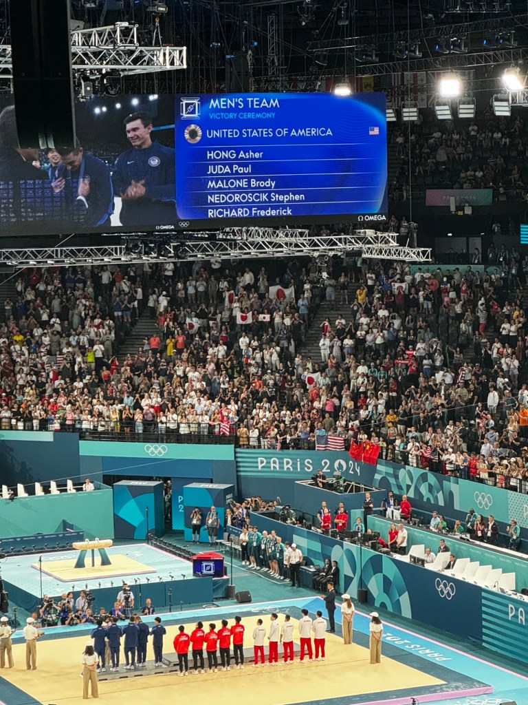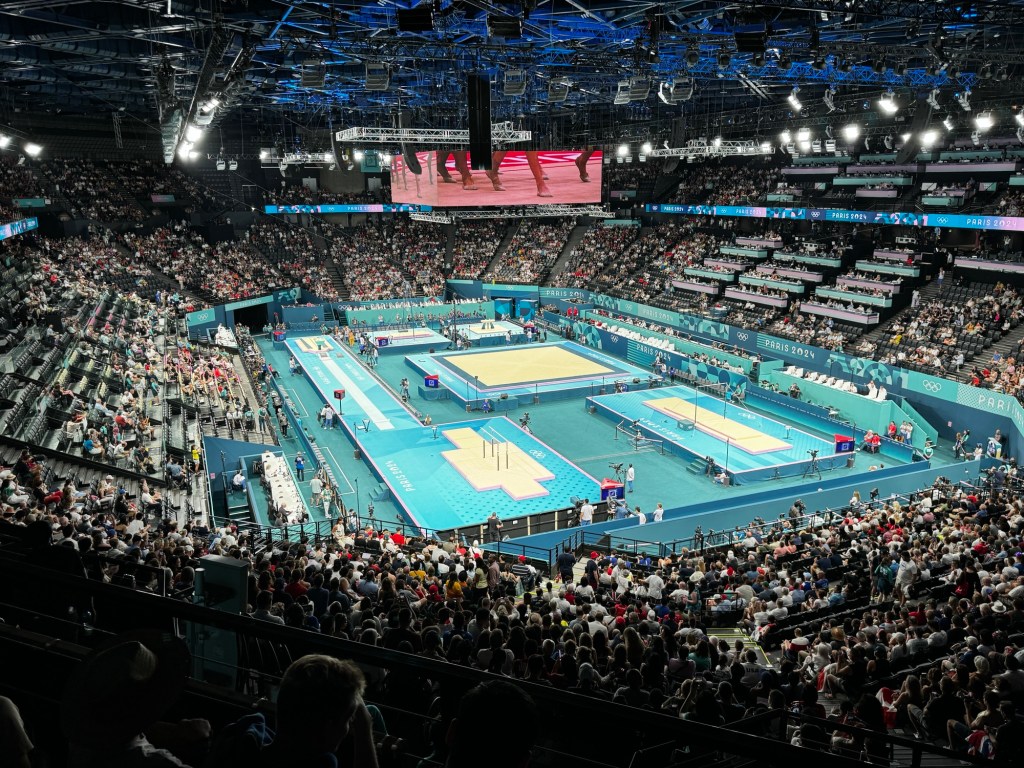 After an easy trip from Brussels this morning, I’ve made it to my first event, and it was a good one. Was lucky to attend the Men’s Gymnastics Finals at Bercy Arena this afternoon. The USA team took their first medal (a Bronze) since 2008. Japan won gold and China took silver in an exciting competition that came down to the last rotation.