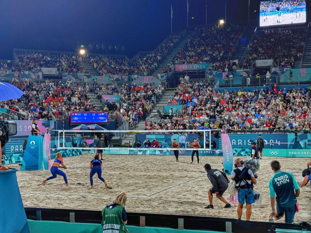 Unfortunately it did begin to pour just as the competition was starting, so I sat out the first match under the stands to keep dry. After a break in the rain, I took my seat to watch a women’s match between Canada and Czechia. Beach Volleyball is a lot of fun, although the constant music and singing can be a little distracting. I don’t know how the competitors are able to focus while the crowd is more interested in singing Sweet Caroline. Oh well, it’s a party 😁