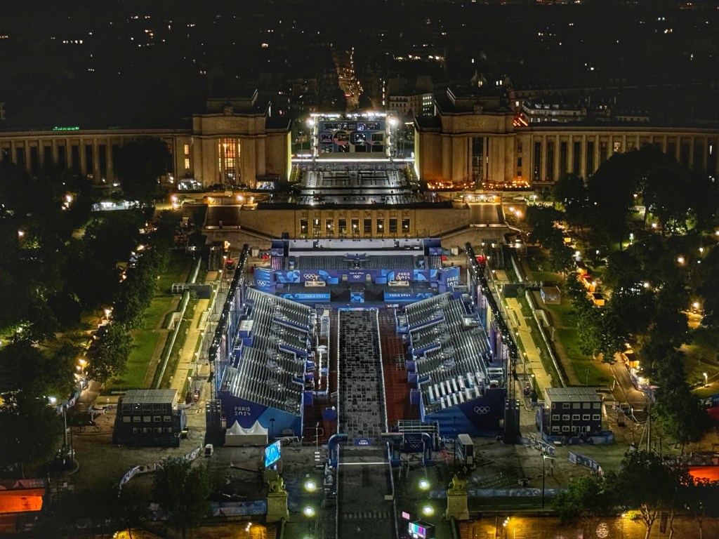 To end the night and the trip, I took the elevator up to the promenade of the Eiffel Tower for a view of Paris at night. Seeing the Trocadero where all the broadcasts are coming from, the beach volleyball venue all lit up at night and the rest of the City of Lights was a great way to end the Olympic portion of my trip.