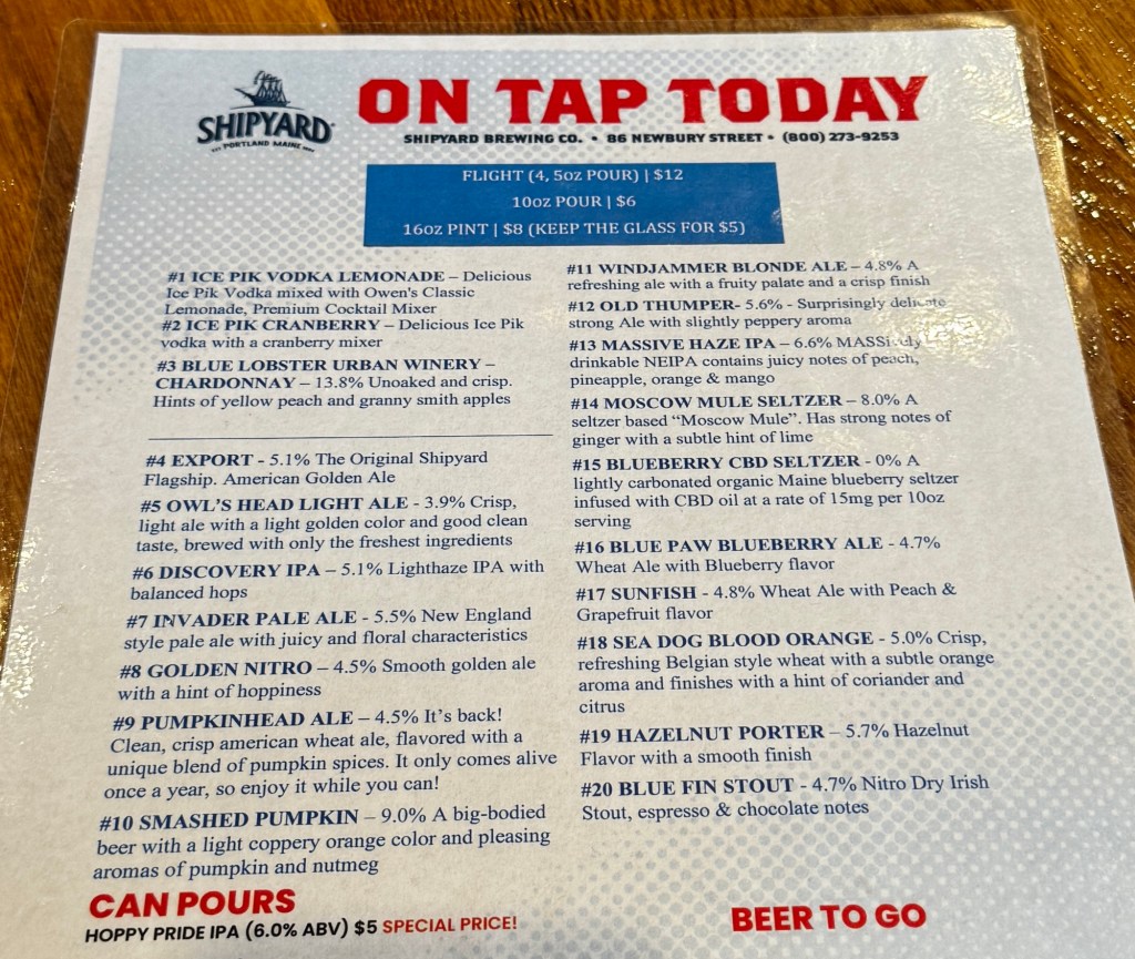 After the walk, I stopped at Shipyard Brewery’s tasting room. The bartender had been with Shipyard for 25+ years as a brewer and told me a bit about the history of the brewery, one of the first craft brewers at the dawn of the craft beer renaissance in the 90s.