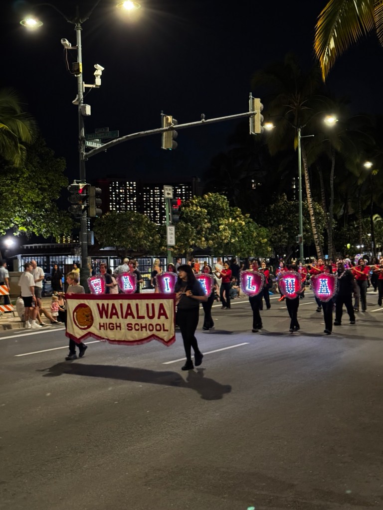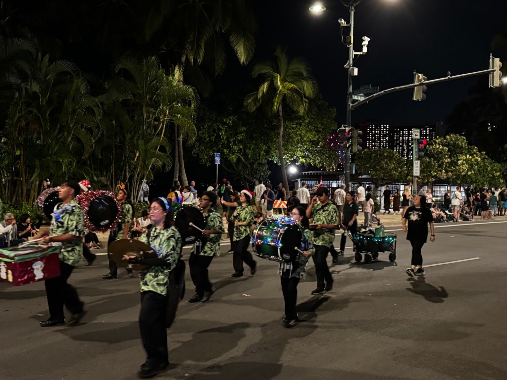 On Friday night, I was lucky to catch the Waikiki holiday parade, right on Kalakaua Avenue. High school and military marching bands parade by, with many singing Mele Kalikimaka, the classic Hawaiian Christmas song.
